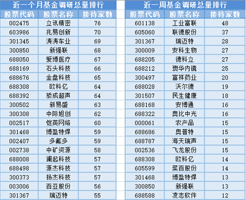 将时间周期缩短到最近一周(11月11日-11月18日)来看,基金调研数量第一的公司是工业富联,属于通信传输设备行业,主营业务为各类电子设备产品的设计、研发、制造与销售,依托工业互联网为全球客户提供智能制造和科技服务解决方案。共被48家基金机构调研,然后被调研数量较多的股票是联德股份、瑞迈特和安科生物,分别接受37家、28家和27家基金机构的调研。