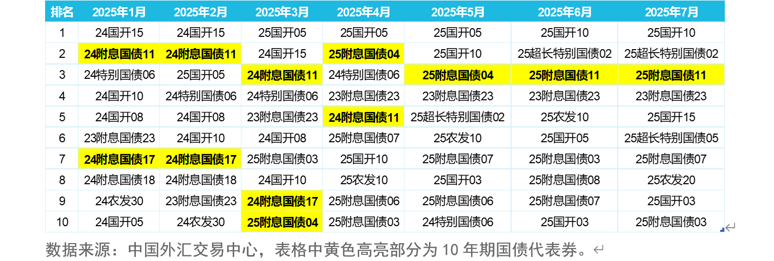 根据中国外汇交易中心披露的月度活跃债券排名统计,以2025年1月-7月的数据为例,始终有10年期国债的代表券排名活跃债券中的前三名