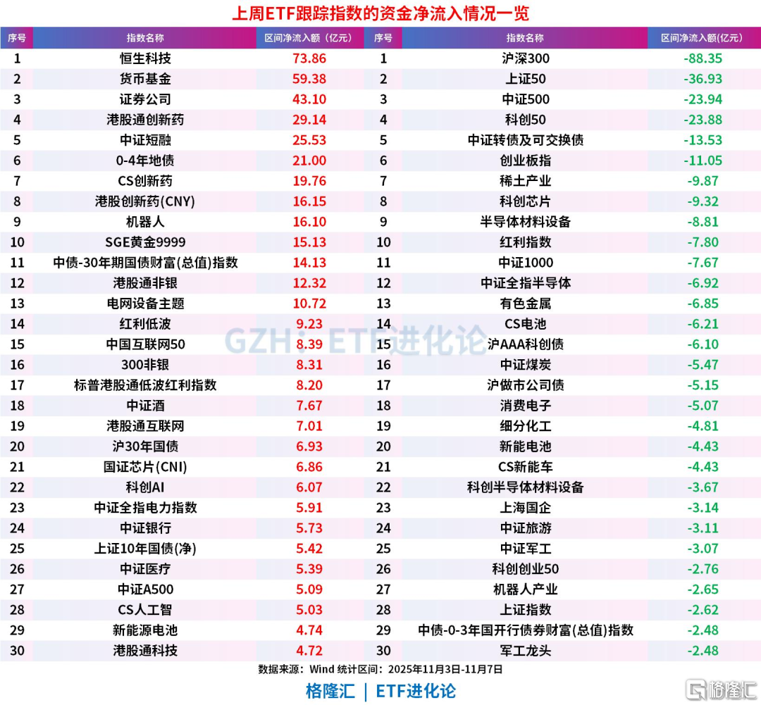 11月3日-11月7日的当周,股票ETF净流出10.35亿元的情况下,跨境股票ETF强势净流入116.3亿元,以恒生科技指数、港股通创新药、中国互联网50为首的跨境指数备受资金青睐。