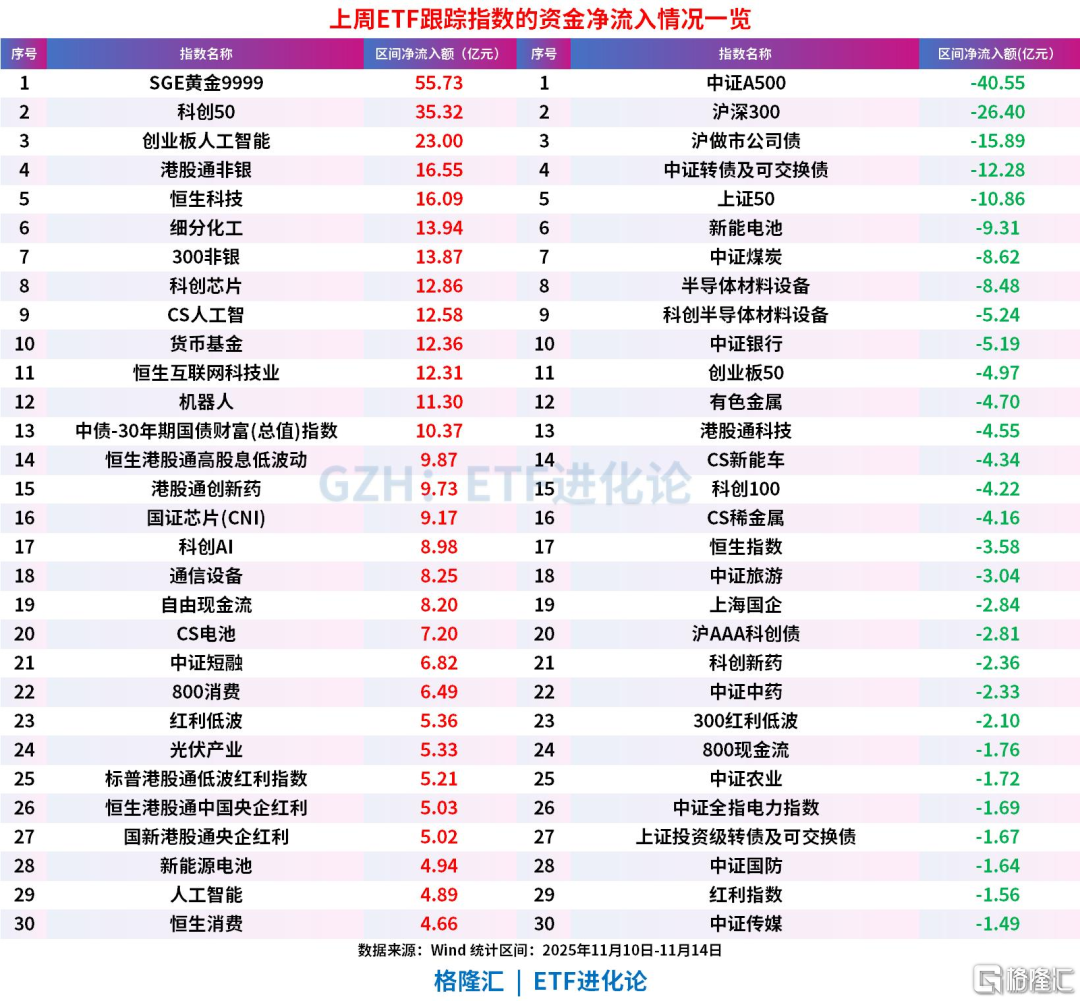 上周,SGE黄金9999、科创50、创业板人工智能分别净流入55.73亿元、35.32亿元、23.00亿元。