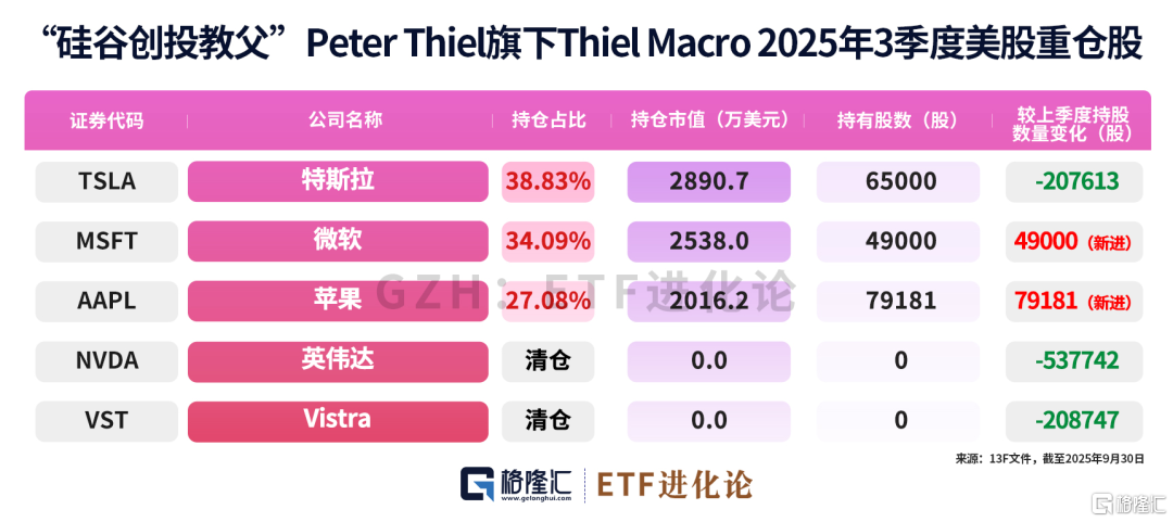 13F报告显示,亿万富翁投资者Peter Thiel的基金在三季度将整体美股持仓规模缩减约三分之二,清仓英伟达,并将特斯拉持股数锐减76%,新建微软与苹果头寸,与他之前的“AI泡沫警告”言行一致。