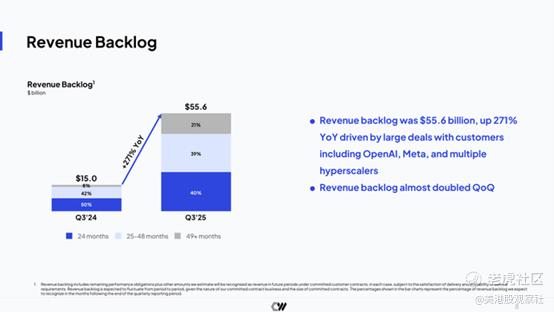 同样重要的是,CoreWeave声称其订单积压未受影响。仅在第三季度,凭借与OpenAI、Meta等公司签订的大额合同,该公司的订单积压额就大幅增加了255亿美元。