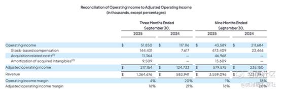 真正值得关注的财务指标是“调整后营业利润”——该指标以营业利润为基础,加回股权激励费用、摊销等非现金支出,同时保留折旧、利息支出等实际成本。即便承担了高额利息支出,CoreWeave仍实现了2.17亿美元的调整后营业利润。