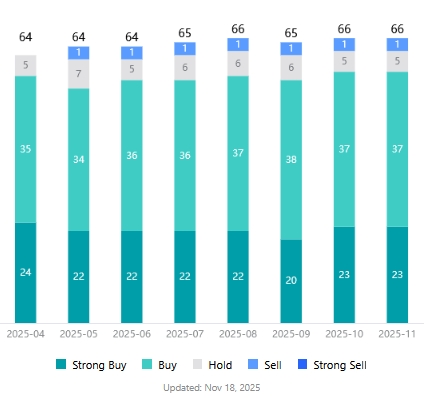 TradingKey股票评分工具显示,分析师对英伟达股票平均目标价为234.404美元,较最新价有约26%的上涨空间。在覆盖英伟达股票评级的66名分析师中,仅一名分析师给予卖出评级,买入评级数量达60个。