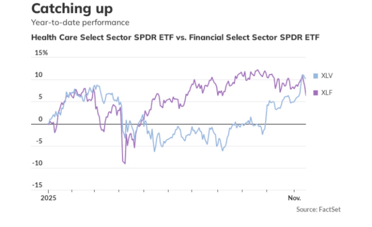 她指出,在过去一周内,医疗保健从年初以来表现最差的板块之一,变成了跑赢金融板块的赢家。医疗保健精选板块SPDR ETF(XLV)今年上涨约10%,而金融精选板块SPDR ETF(XLF)涨幅在6%以上。