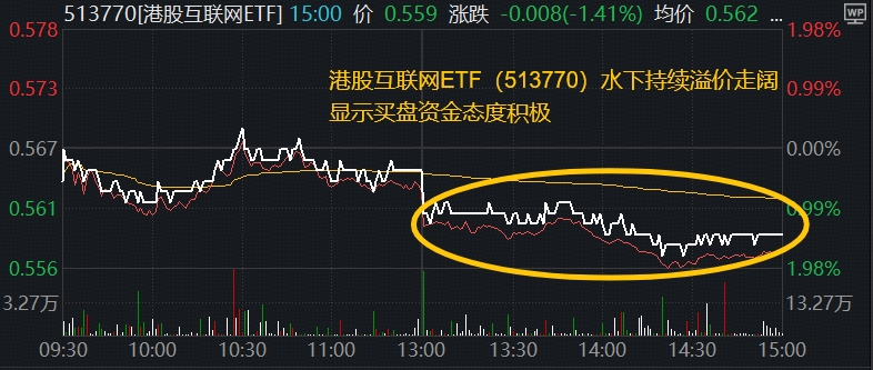值得一提的是,受外围市场扰动,代表阿里、腾讯等国产AI核心龙头的港股互联网却走势低迷。百亿港股互联网ETF(513770)日线3连阴,回调至半年线下方。盘中溢价持续走阔,显示买盘资金躁动,近20日已有近13亿资金进场布局。