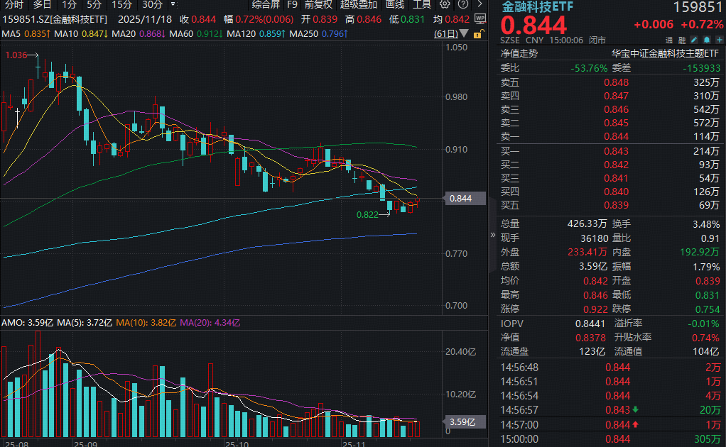 金融科技板块逆市活跃,金融IT方向多股上涨。其中,格尔软件斩获两连板,神州信息涨超5%,税友股份、恒生电子、拓尔思、润和软件等多股跟涨超2%。热门ETF方面,百亿金融科技ETF(159851)场内收涨0.72%,单日成交3.59亿元。日线低位两连阳,或释放右侧布局信号。