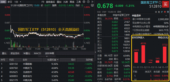 大市深度调整背景下,国防军工行情“一日游”,今日随市走低,场内热门国防军工ETF(512810)场内收跌1.31%,全天延续溢价交易,显示买盘仍活跃。此前6日,512810连续吸金合计逾亿元。