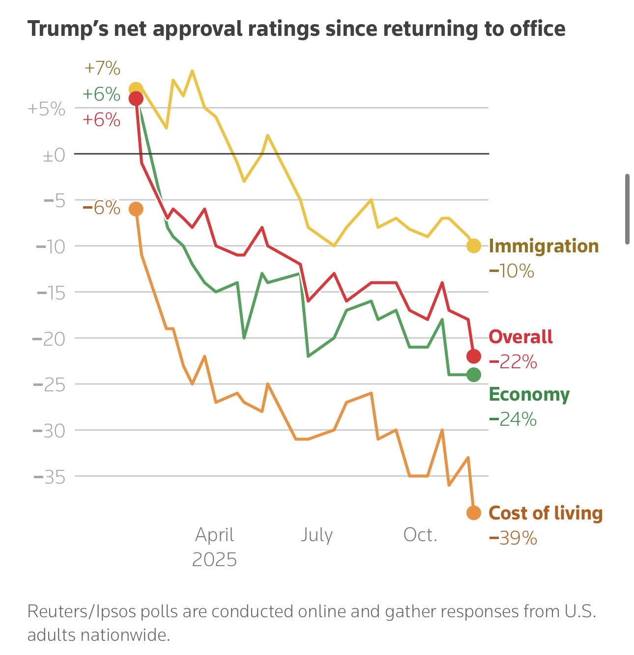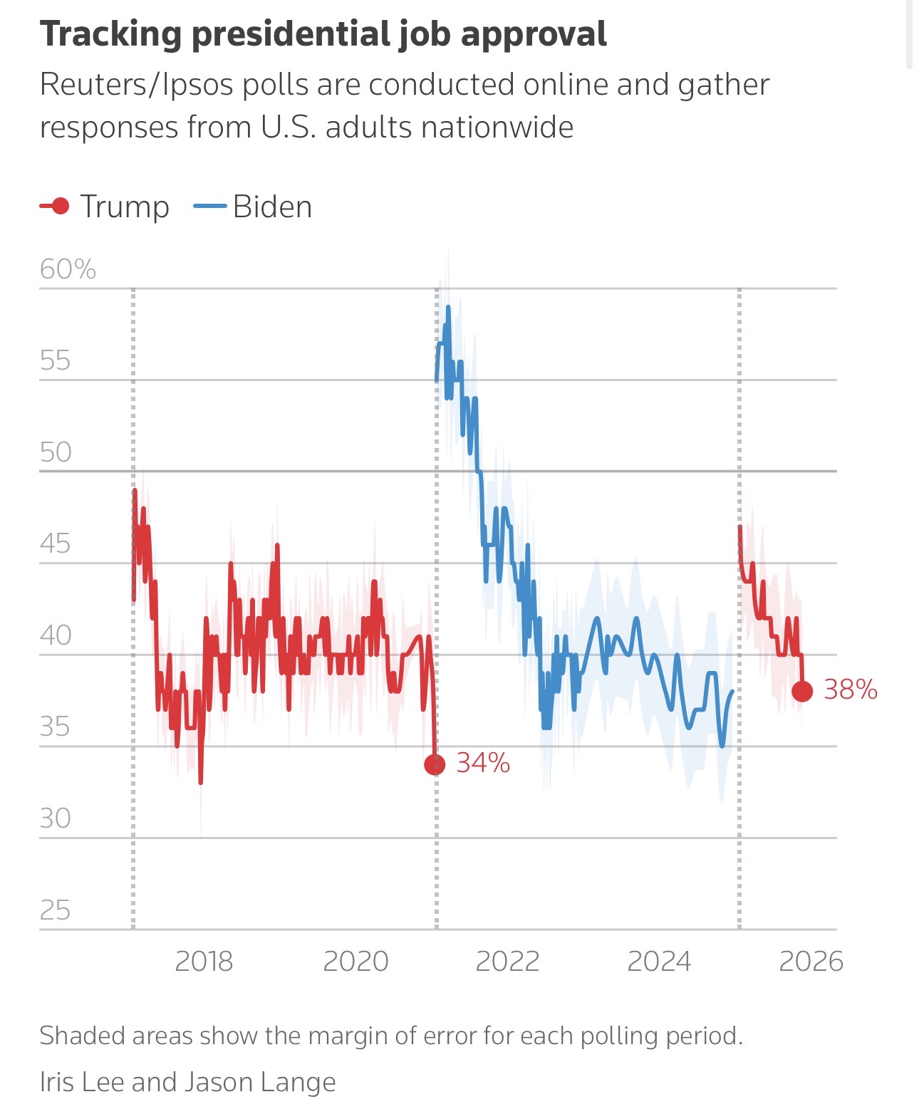 路透社/益普索的一项民调显示,特朗普的支持率跌至38%,是他第二个总统任期以来的最低点。美国民众对他在生活成本问题上的应对方式,以及他对性犯罪者爱泼斯坦案件相关处理感到不满。