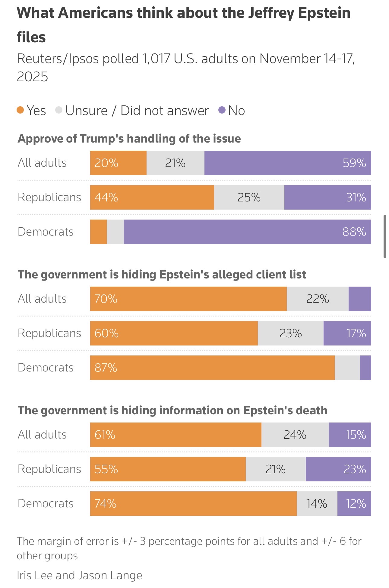 大约70%的受访者——其中包括87%的民主党人和60%的共和党人,认为政府在隐瞒爱泼斯坦客户的信息。