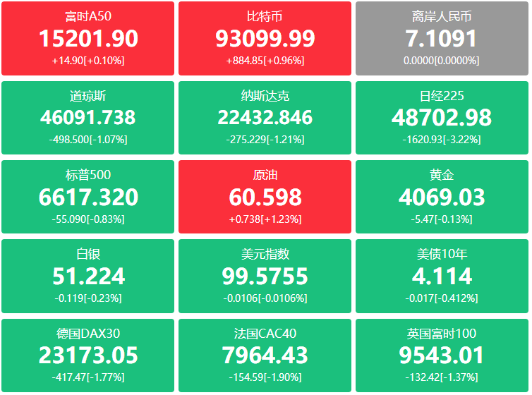 外盘:人工智能相关股票估值担忧继续施压,美股集体收跌,道指跌498.50点,跌幅1.07%报46091.74点;纳指跌275.23点,跌幅1.21%报22432.85点;标普500跌55.09点,跌幅0.83%报6617.32点;道指与标普均录得连续第四个交易日下跌,纳指则录得六个交易日内第五次下跌;大型科技股多数下挫,亚马逊、AMD跌超4%,微软、英伟达跌超2%,特斯拉跌超1%;中概股涨跌互现,纳斯达克中国金龙指数收涨0.42%,爱奇艺涨超6%,百度涨超2%,阿里巴巴、网易涨超1%;拼多多跌超7%并创5月27日以来最大跌幅,老虎证券跌超2%,蔚来跌超1%。