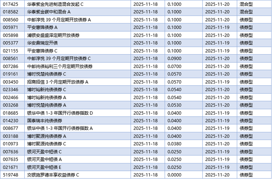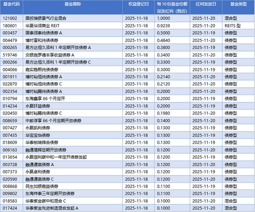 (1)11月18日新发基金共有2只,主要为混合型基金;基金分红50只,多为债券型,派发红利最多的基金是国投瑞银景气行业证券投资基金,每10份基金份额派发红利1.0000元。