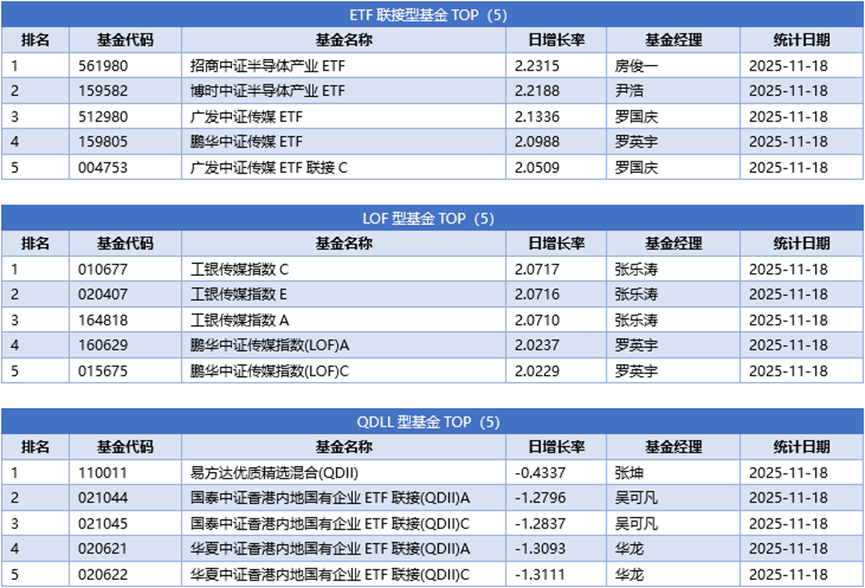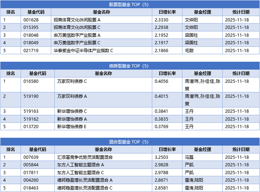 单基金方面,剔除掉 创新封基类型 基金的影响,11月18日业绩表现最好的基金为汇添富竞争优势灵活配置混合,日增长率为3.2503%,其次为东方人工智能主题混合A,日增长率为2.9828%、东方人工智能主题混合C,日增长率为2.9788%。