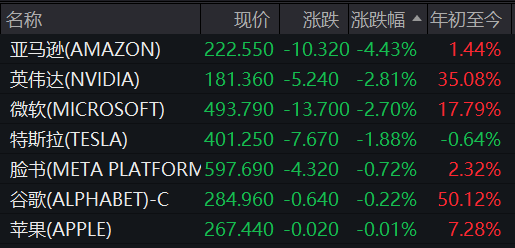 科技股集体走弱,"科技七巨头"全线下挫,亚马逊大跌4.43%,英伟达跌2.81%,微软跌2.7%,特斯拉跌1.88%。英伟达本月已下跌超10%,市场正密切关注其将于周三公布的三季度财报。美股市场芯片股普遍下跌,费城半导体指数跌2.31%,迈威尔科技大跌近6%,美光科技跌逾5%,超威半导体跌超4%,ARM跌逾3%。