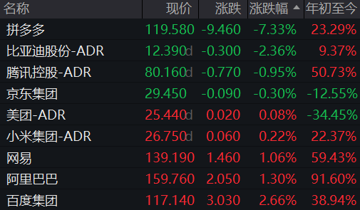 与美股疲软形成鲜明对比的是,中国资产表现强势。纳斯达克中国金龙指数上涨0.42%,阿里巴巴涨1.27%,百度涨2.66%,中国苏轩堂药业大涨18.52%,爱奇艺、小牛电动涨超6%,有道涨超4%。值得注意的是,拼多多虽跌7.33%,但整体中概股表现优于美股。