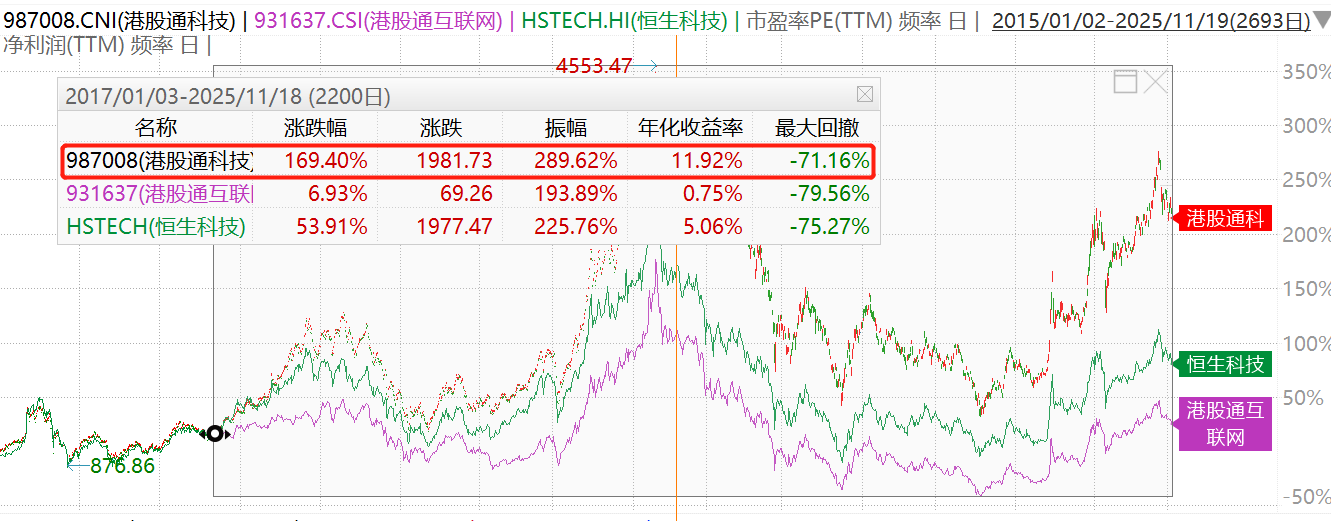 港股通科技ETF招商(159125)跟踪国证港股通科技指数,从港股通范围内精选30家市值领先、研发投入高、营收增长快的科技企业作为成份股,涵盖腾讯控股、阿里巴巴、小米集团、美团、中芯国际、比亚迪股份等细分领域龙头,Wind数据显示,截至2025年10月21日,自2017年以来指数累计收益率达169.40%,大幅跑赢同期中证港股通互联网指数6.93%的涨幅。