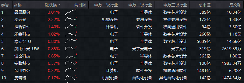 成份股方面,晶晨股份领涨超3%,凌云光涨逾2%,福昕软件、乐鑫科技涨超1%,寒武纪、奥比中光、金山办公等个股跟涨。