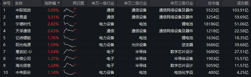 细分方向来看,光模块三巨头强势上攻,中际旭创涨超5%,新易盛涨逾3%,天孚通信涨超2%;新能源亦有亮眼表现,宁德时代涨超2%,亿纬锂能、阳光电源涨逾1%。