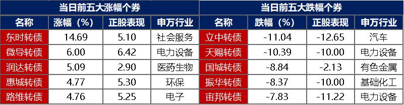 【转债市场主要指数集体跟跌】 11月18日,转债市场跟随权益市场继续走弱,当日中证转债、上证转债、深证转债分别收跌0.55%、0.31%、0.78%。当日,转债市场成交额686.41亿元,较前一交易日缩量43.82亿元。转债市场个券多数下跌,399支转债中,106支收涨,285支下跌,8支持平。当日上涨个券中,东时转债涨超14%,微导转债涨超6%;下跌个券中,立中转债跌逾11%,天赐转债跌逾10%。