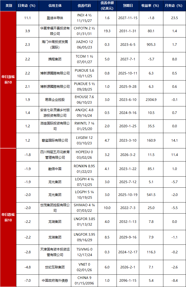 11月18日,2只产业债成交价格偏离幅度超10%,为“23万科01”涨超11%,“H0宝龙04”涨超37%。
