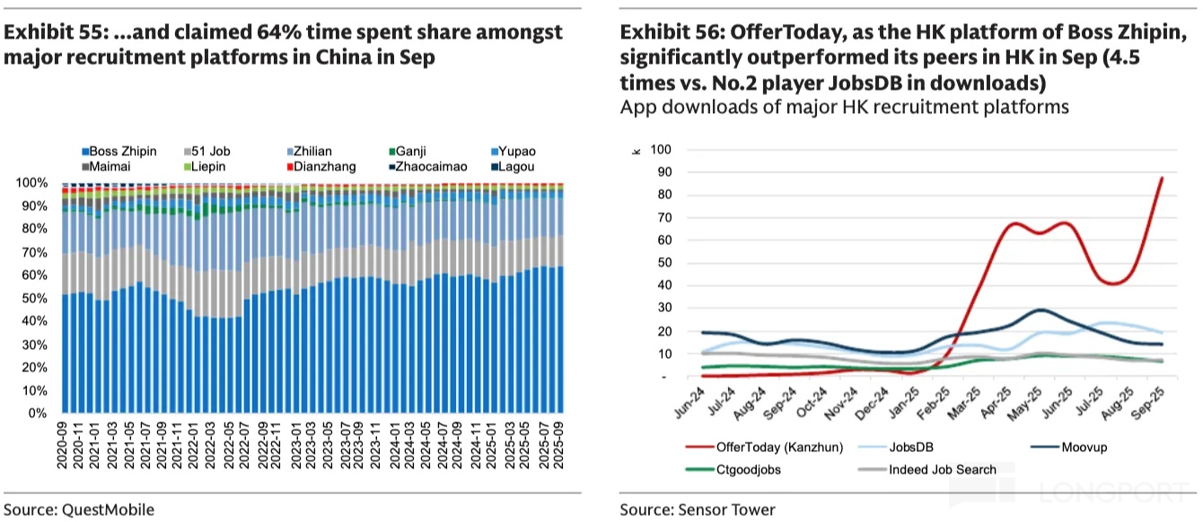 这个趋势部分有环境的因素,比如制造业等蓝领,AI、汽车等新需求领域的企业活力会相对更高一些,但海豚君认为,BOSS 直聘的竞争优势同样是推动 “平台数据回暖” 的重要因素——MAU 市占率上,BOSS 直聘持续提升,境外地区的渗透也正在推动。