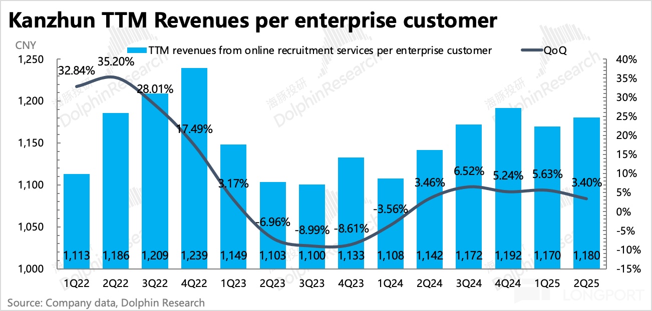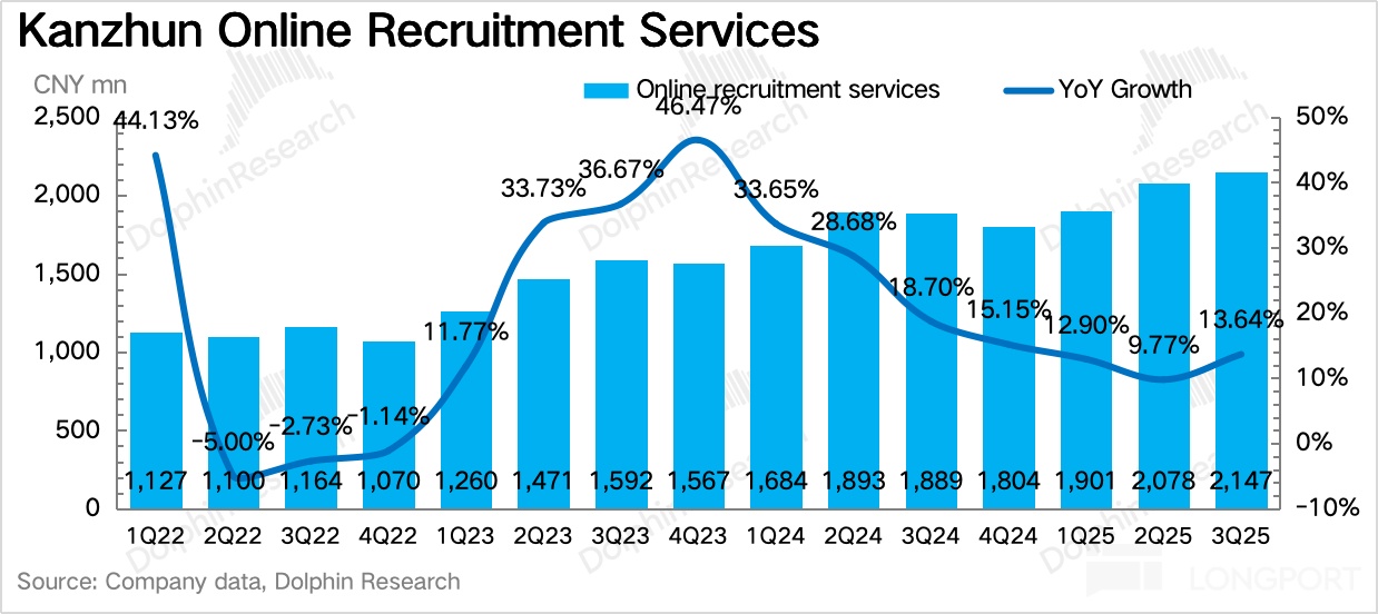 三季度总收入 21.6 亿,同比增长 13%,环比也增加。其中 ToB 端网络招聘服务收入 21.5 亿,同比增长 13.6%。其他收入 16.44 亿,同比下滑 27%,主要是对求职者部分增值服务做了优化,通过提供更多免费服务保持生态粘性。因此从这个角度来说,企业端的招聘收入实际上略超市场预期。