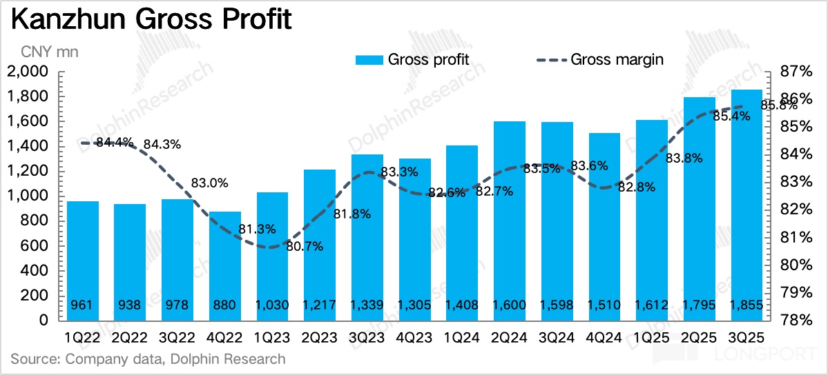 三季度 BOSS 直聘毛利率环比稳定在 85.8%,同比去年提升 2pct。核心主业的经营利润(收入 - 成本 - 销售费用 - 研发费用 - 行政费用)实现 6.9 亿超预期,利润率 32%,同比去年的 17% 大幅优化 15pct。