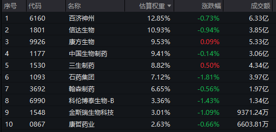 港股通创新药ETF(159570)标的指数成分股多数飘绿:石药集团、科伦博泰生物-B、金斯瑞生物科技跌超1%,百济神州、信达生物、中国生物制药、翰森制药、康哲药业微跌。