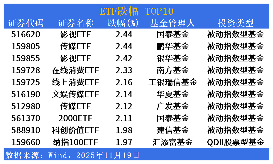 跌幅方面,影视、传媒相关ETF回调居前