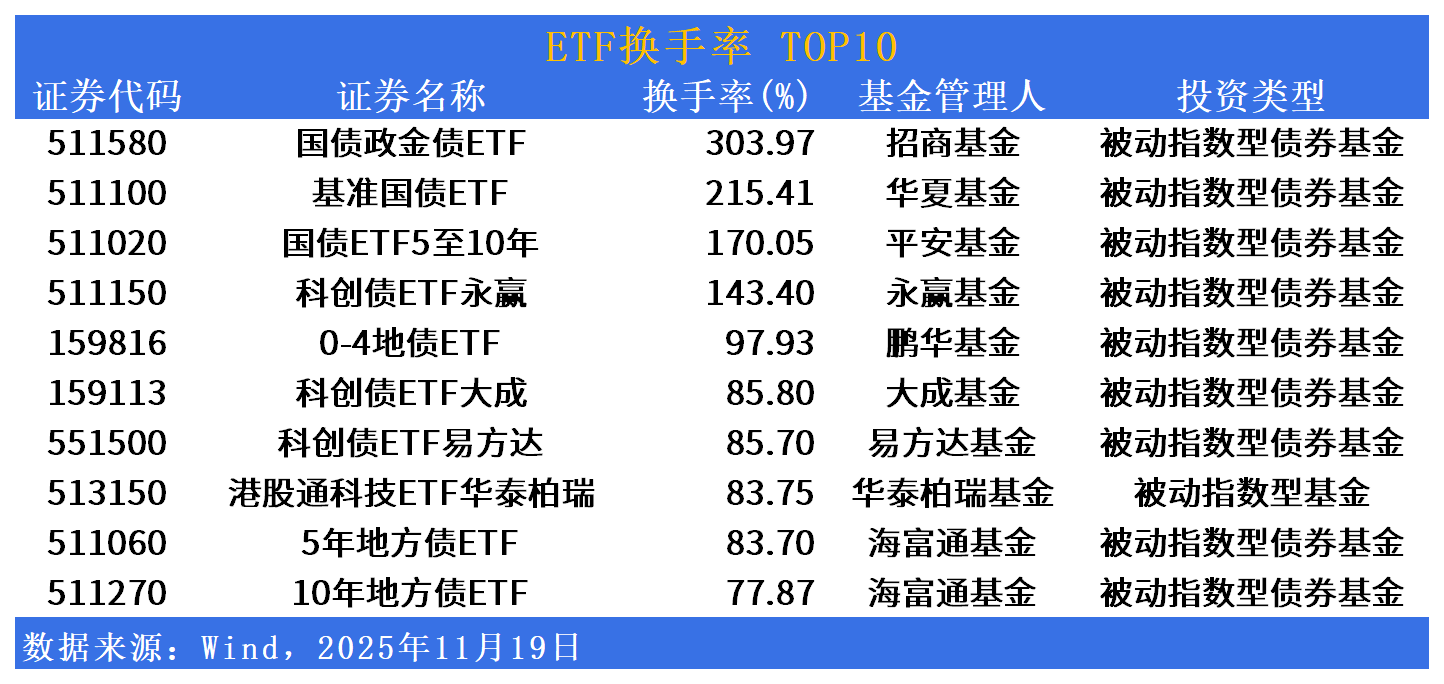 换手率方面,国债政金债ETF(511580)换手率居首,达300%;基准国债ETF(511100)、国债ETF5至10年(511020)、科创债ETF永赢(511150)换手率居前。