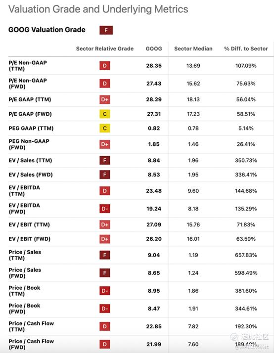 在不考虑增长的假设下,以当前股价计算,谷歌的估值偏高:市盈率约为28.5倍,市销率约为9倍,市净率约为9倍。下图展示了更多估值倍数,整体均处于较高水平。