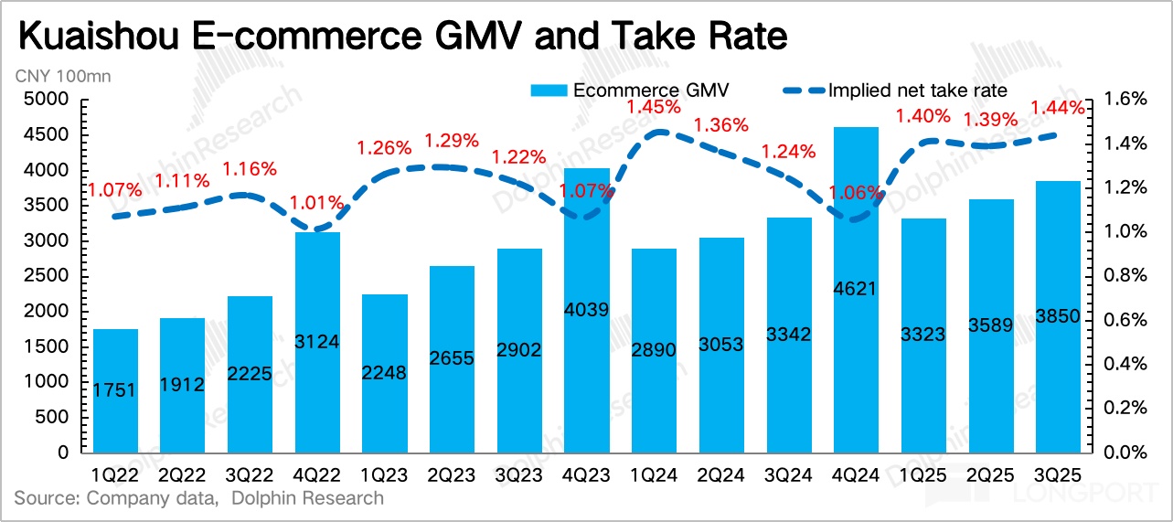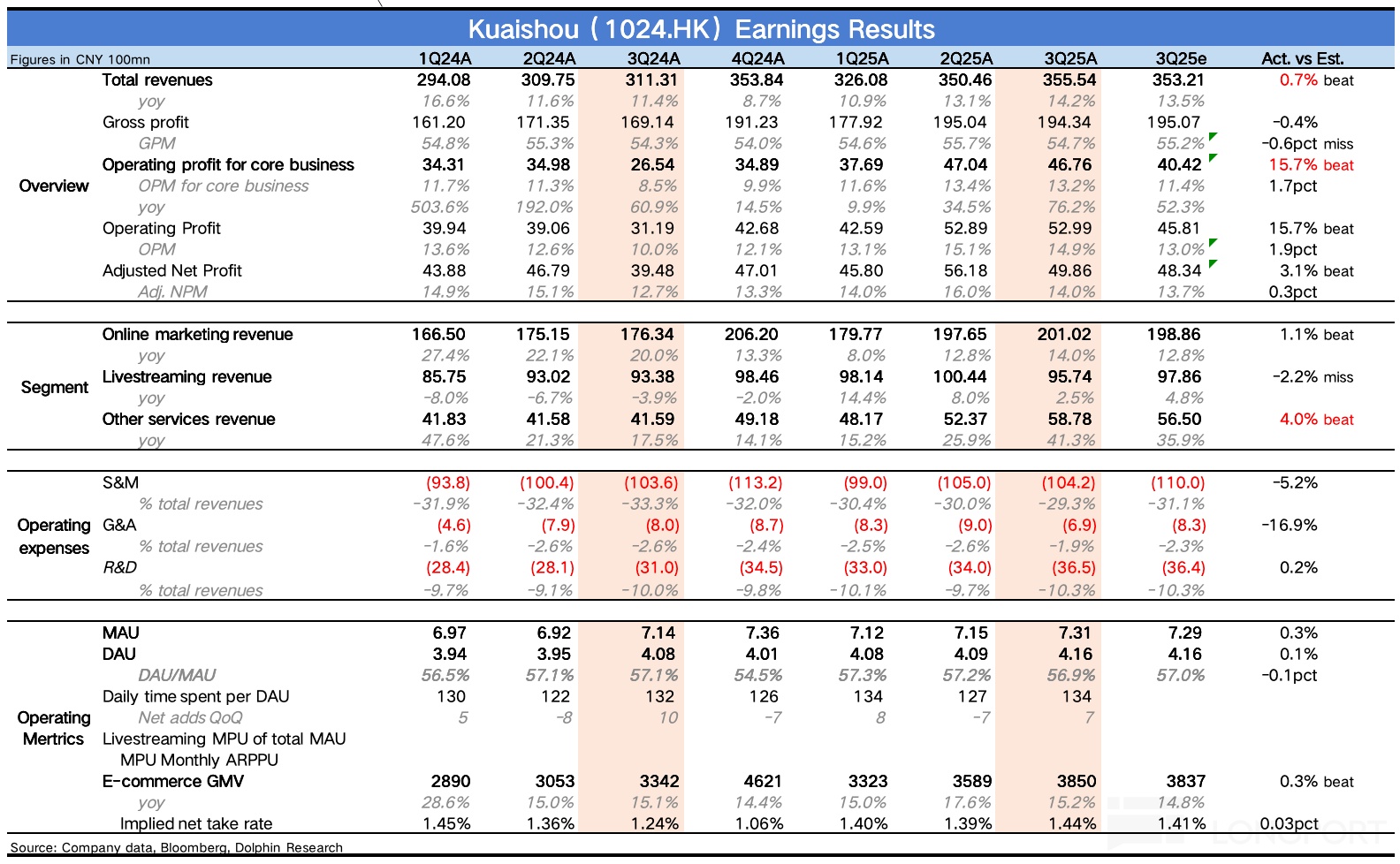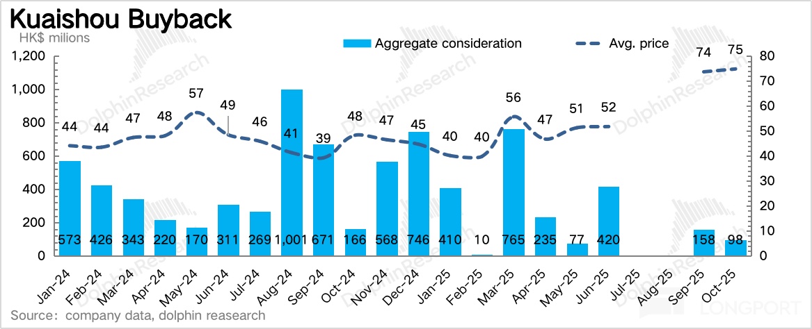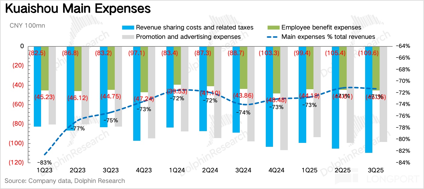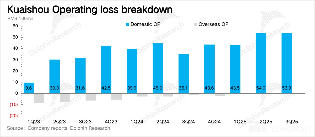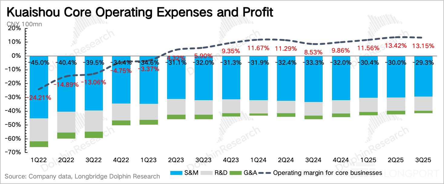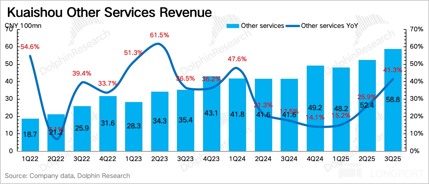 3. 电商增长放缓:三季度 GMV 增速 15%,相比上季度有所放缓。基数变化固然有影响,但环比看季节间波动,三季度的增速也小幅不及往期,这其中或许与部分达人停播有关。但如果剔除可灵(按 3.2 亿算)再看其他收入,那么本季度同比增速高达 34%,不仅明显加速,也显著高于 GMV 增速。
