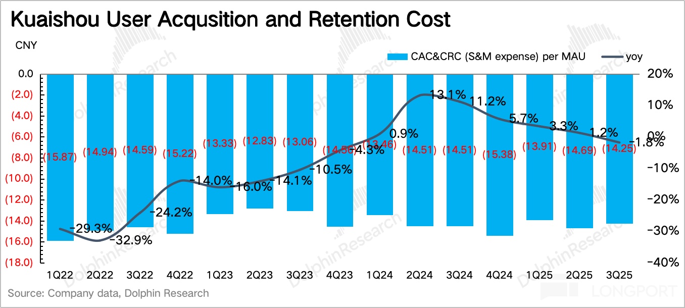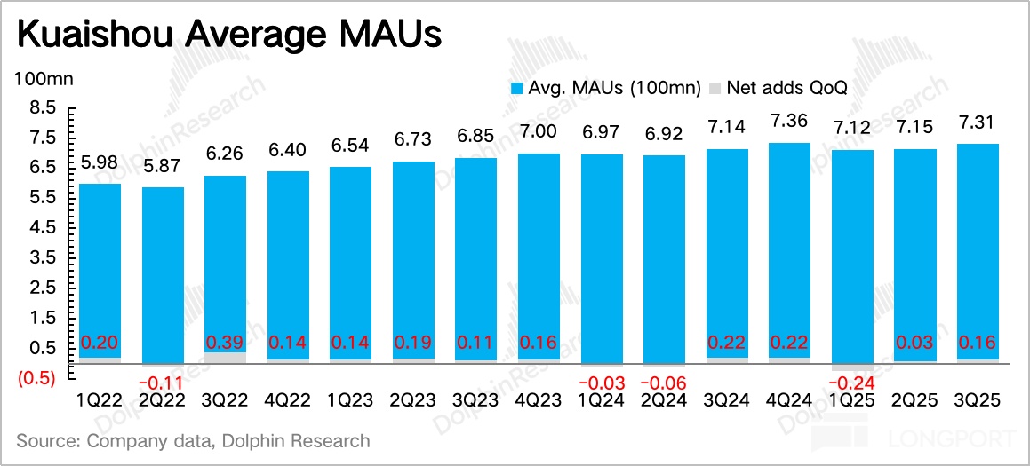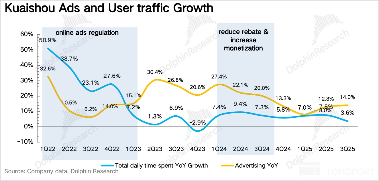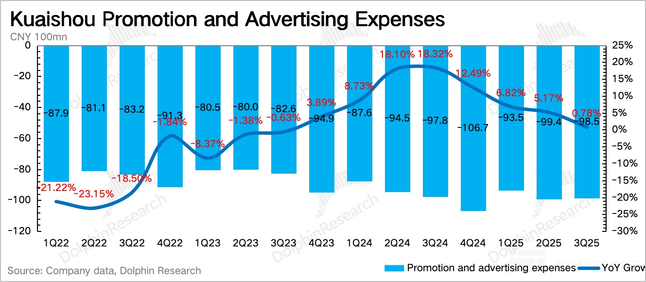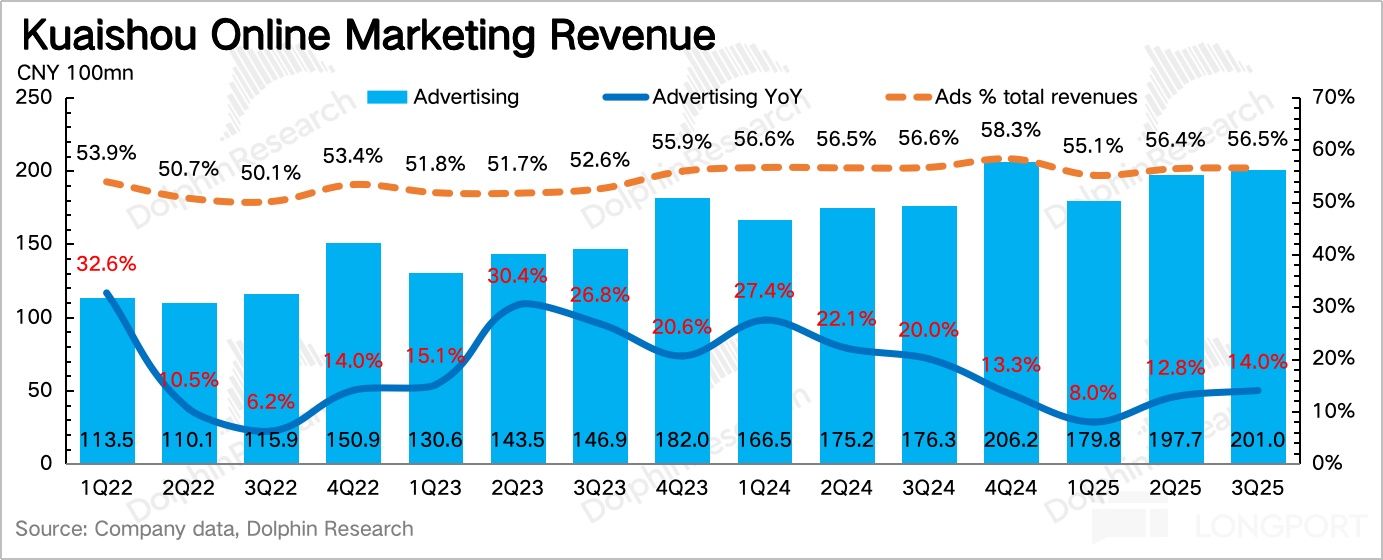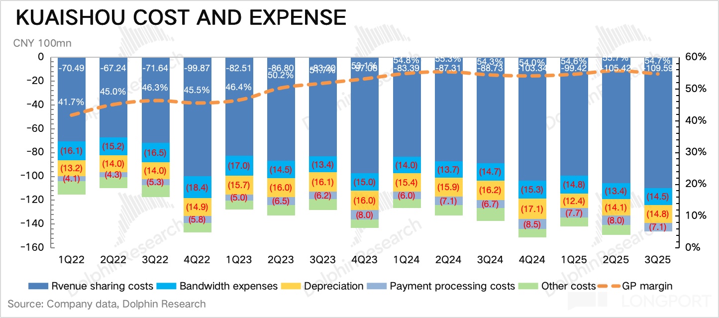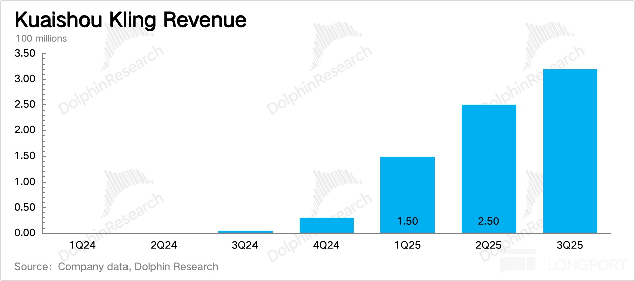 3. 电商增长放缓:三季度 GMV 增速 15%,相比上季度有所放缓。基数变化固然有影响,但环比看季节间波动,三季度的增速也小幅不及往期,这其中或许与部分达人停播有关。但如果剔除可灵(按 3.2 亿算)再看其他收入,那么本季度同比增速高达 34%,不仅明显加速,也显著高于 GMV 增速。