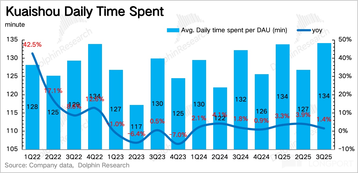 快手的用户指标近两年来在第三方平台表现一直不太好,虽然数据不够全面,但至少横向对比看,压力比同行更大。Q3 实际财报披露的用户指标,也是保持平稳,但日均用户时长创新高,可能与短剧、独家晚会等丰富内容带来的增长。