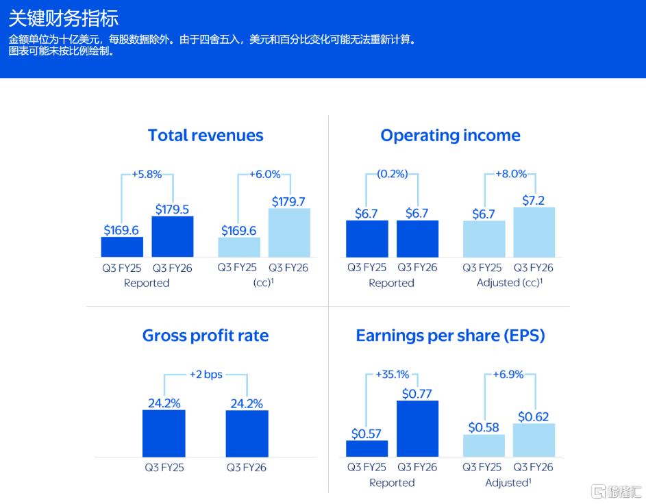 财报显示,沃尔玛在三季度营收1795亿美元,同比增长5.8%,高于预期的1774.3亿美元;调整后运营收益72亿美元;调整后每股收益0.62美元,高于分析师预期的0.6美元。