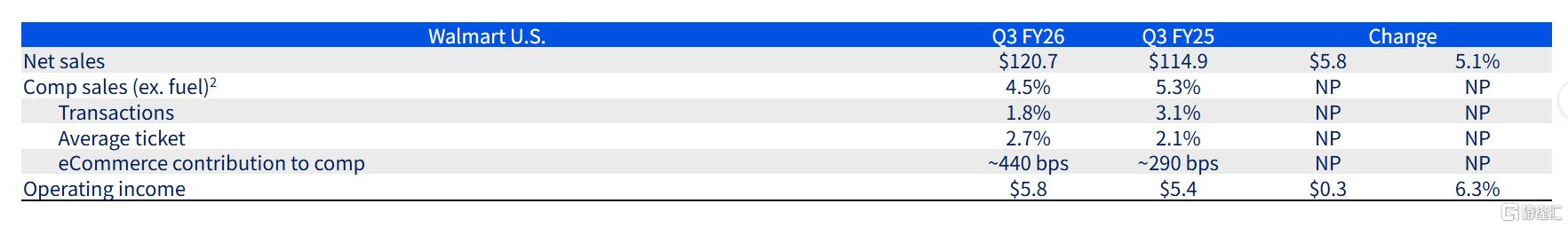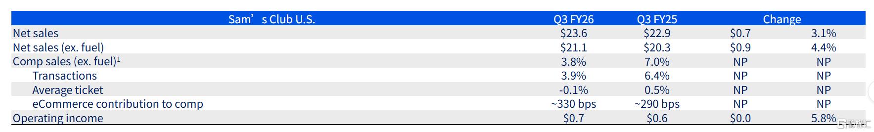 子品牌山姆会员店的销售额约236亿美元,同比增长3.1%;不含燃油的可比销售额增长约4.4%;电商增长约22%。