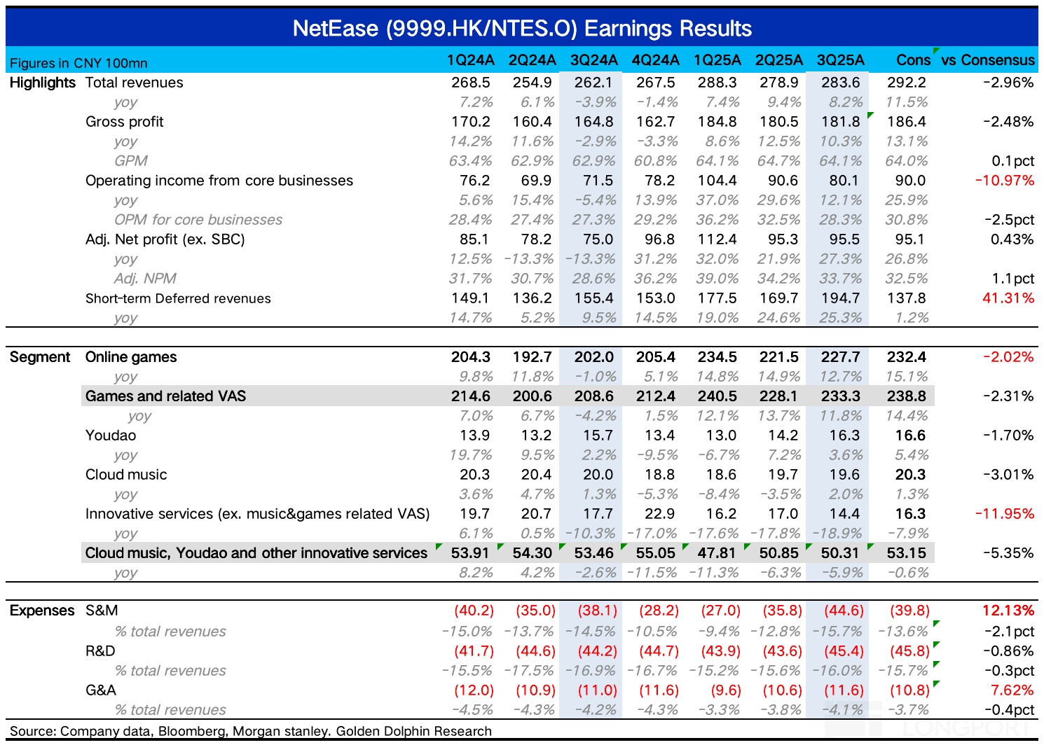 $网易-S(09999.HK) $网易(NTES.US) 于北京时间 11 月 20 日港股盘后发布了 2025 年三季度财报。和 Q2 一样,又是一次预期饱满下的 miss。考虑到月初有机构提及了预期过高的风险,部分资金可能打过预防针。