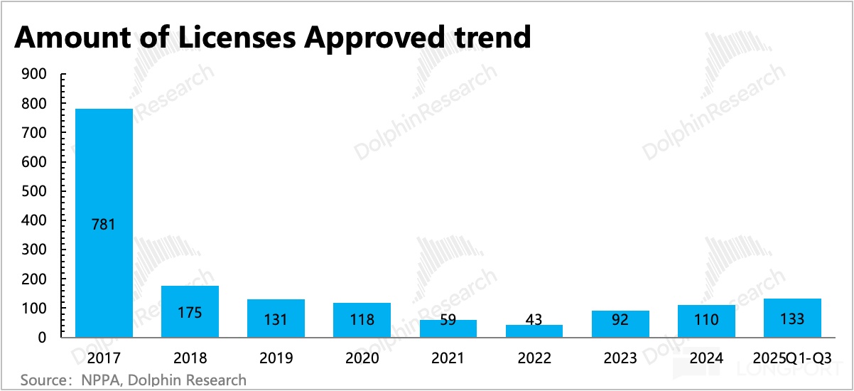 这种弹性放在网易这种头部游戏公司中,是存在适度的自主调控空间的,当然外部竞争的强弱也会直接影响可调控的空间。近两年来,政策面明显逐步积极,游戏版号的发放虽然和顶峰时期不能比,但总量缓慢放大的趋势没有变,同时版号发放的分布上,也尽量做到大小公司维持相等份额。