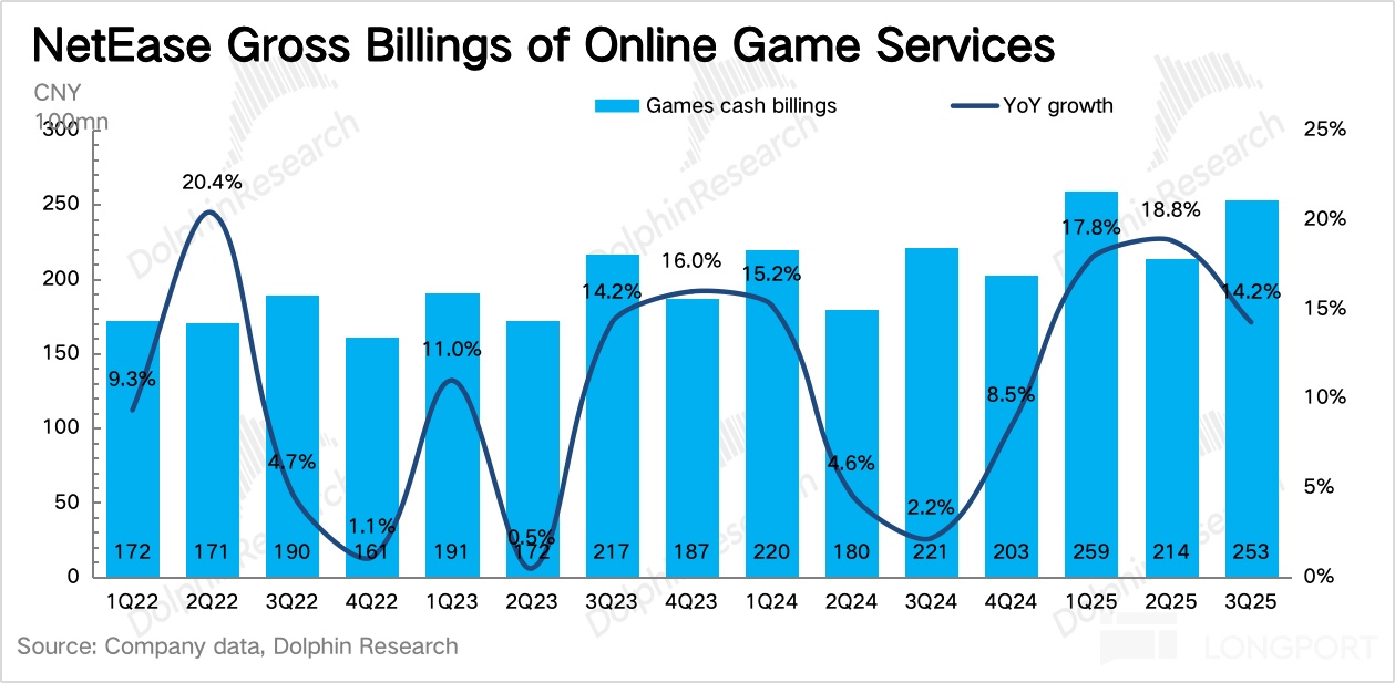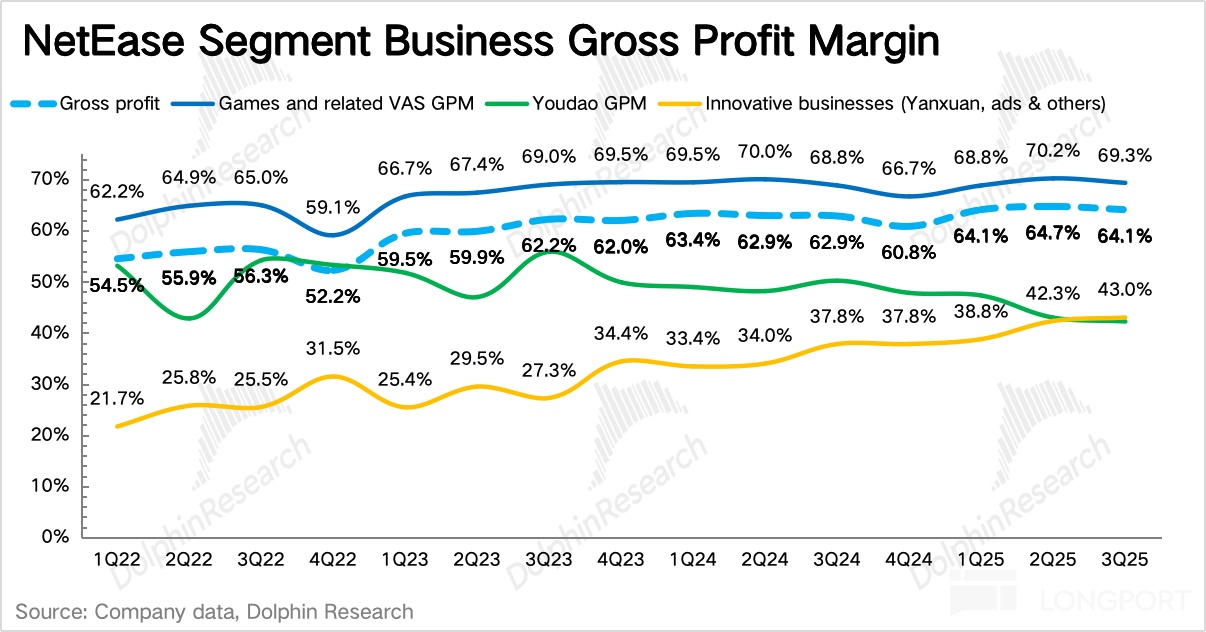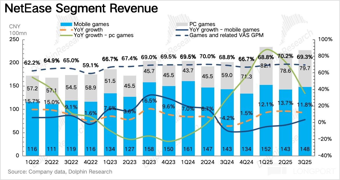 递延收入来看,Q3 同比增长 25%,环比增长 15%。计算得当期流水增速 14%,但前几年三季度网易都有 S 级游戏撑场,要么手游要么端游,今年主要靠中性规模级别的新游戏和老游戏翻新的合力,来保持增长。