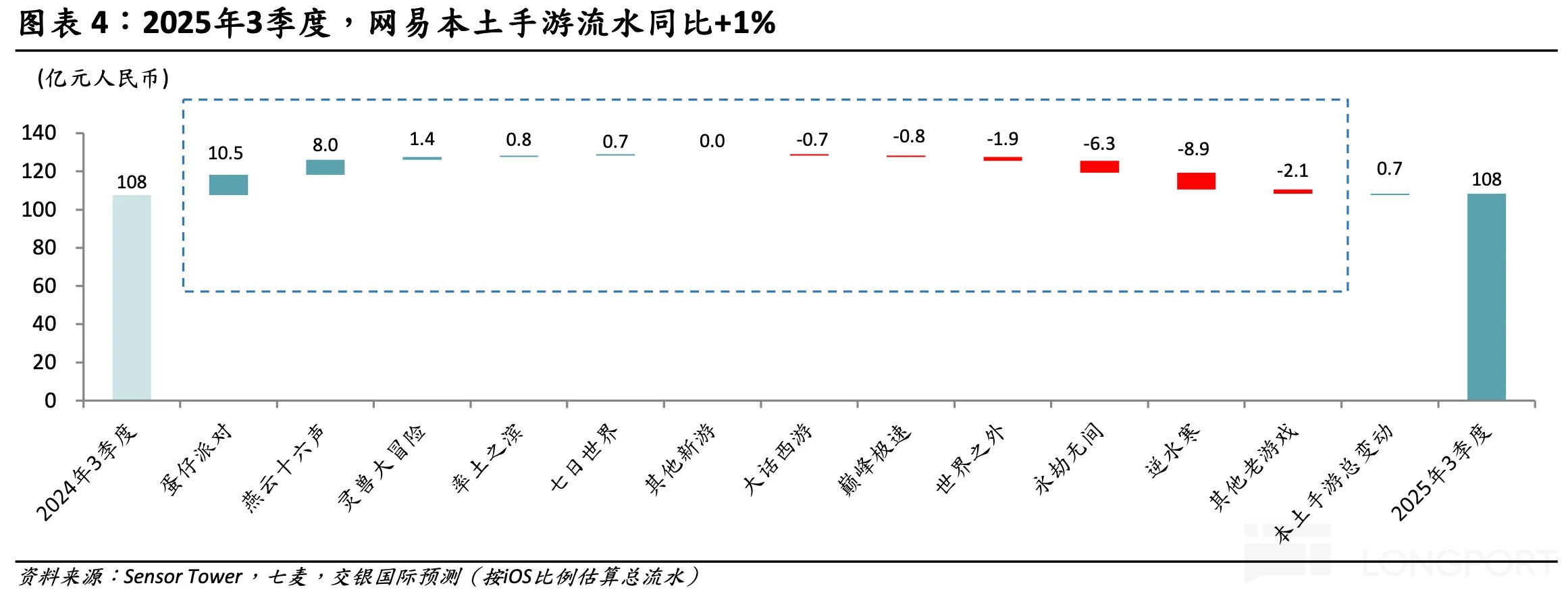 但三季度暑期期间,手游上《蛋仔派对》、《燕云十六声》都做了比较大的内容更新,《梦幻西游手游》8 月末推出轻享服,以及中小体量的《灵宠大冒险》增量,一起带动国内手游端流水回归正增长。而海外手游上,因为有《命运:群星》新游发布的增量,iOS 端流水增速 18%,同样也不差。