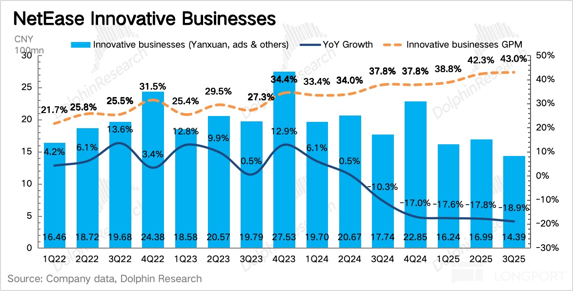 三季度有道教育收入增长 3.6%,增长来源于广告收入,学习机和在线课程仍在大幅下滑。云音乐中,社交娱乐的负面影响继续减弱,但整体收入并未如预期所想的回归正增长。而其他创新业务收入下滑 19%,显著低于预期,主要受严选拖累。