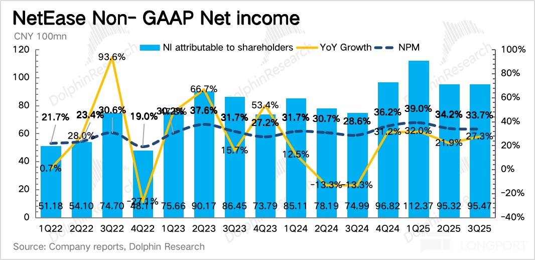 毛利率环比保持稳定,同比提升 1pct,主要是自研游戏占比增加。最终 Non-GAAP 净利润 95 亿,由于仅做了 SBC 费用的调整,因此虽然符合预期,但主要是投资收益(同比多 8 亿)等项带来。单看核心主业的经营利润是 80 亿,低于市场预期的 90 亿。