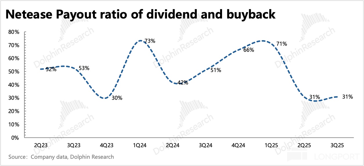 三季度末,网易账上净现金 1532 亿,合 215 美金,相比 Q1 净增 17 亿美元。三季度正常派发股息,但回购近乎暂停,2023 年开始的三年 50 亿回购额度,眼看年底要到期,公司决定再展期三年,但不新增额度。这意味着回购部分的年化收益率,在目前 845 亿市值下,已不足 1%。加上股息的 2.2%,整体股东回报也就 3%,对估值已经没有太多额外的助力。