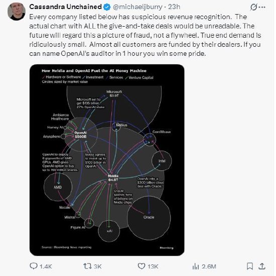 在他的第二条帖子中,伯里指出了英伟达与其他人工智能公司(包括OpenAI、微软和甲骨文)之间的“闭环交易”。