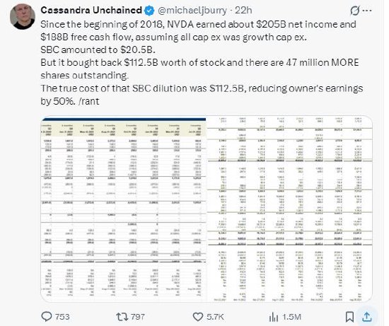 在第三条帖子中,伯里写道,自2018年初以来,英伟达已经回购了价值近1130亿美元的股票,但它还有4700万股未发行股票。