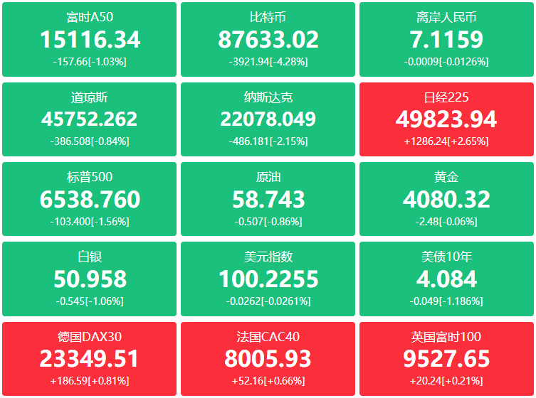 期货:现货黄金持平报4077.91美元;黄金期货跌0.16%报4076.40美元;原油期货跌0.30美元,跌幅0.50%报59.14美元;布伦特原油跌0.13美元,跌幅0.20%报63.38美元;天然气期货报4.4740美元;汽油期货报1.9184美元,取暖油期货报2.5333美元。