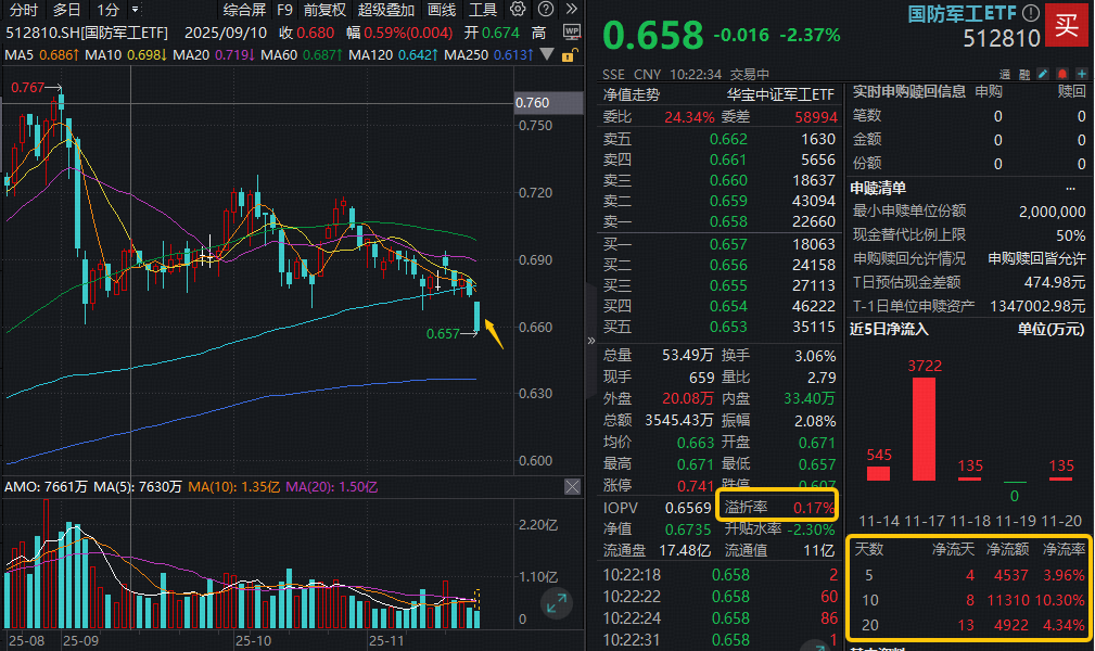 阶段新低时刻,国防军工ETF(512810)场内高频溢价,显示买盘相对强势,或有资金逢跌介入。拉长时间看,此前10日累计逾1.13亿元资金净流入。