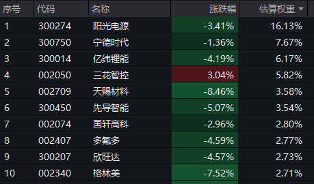 电池50ETF(159796)标的指数成分股多数回调,电池化学品板块领跌,天华新能跌超18%,星源材质跌超11%,容百科技跌超10%、恩捷股份跌停,瑞泰新材、五矿新能等跌超9%,天赐材料跌超8%,格林美跌超7%,阳光电源、亿纬锂能等跟跌,仅三花智控、银轮股份逆势上涨。