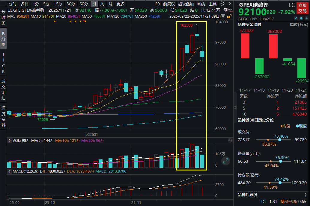 近期,碳酸锂期货市场供需失衡引发投机热潮,广期所出手降温。11月20日,广州期货交易所发布相关公告表示,自2025年11月20日交易时起,碳酸锂期货LC2601合约的交易手续费标准调整为成交金额的万分之一点二,日内平今仓交易手续费标准调整为成交金额的万分之一点二。业内人士认为,此次举措旨在引导市场理性交易、防范品种短期过度波动,同时提升市场运行的稳健性。