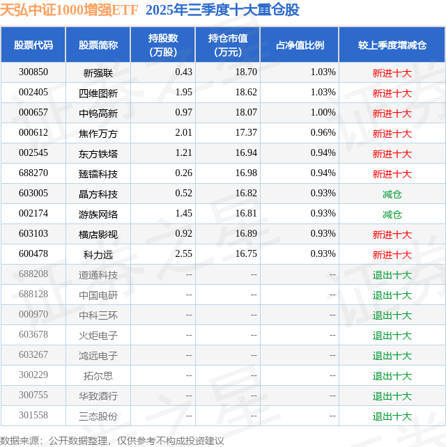 根据2025基金Q3季报公募基金重仓股数据,重仓该股的公募基金共1家,其中持有数量最多的公募基金为天弘基金的天弘中证1000增强ETF。天弘中证1000增强ETF目前规模为0.18亿元,最新净值1.3207(11月20日),较上一交易日下跌0.62%,近一年上涨35.0%。该公募基金现任基金经理为杨超 林心龙。杨超在任的基金产品包括:天弘中证500指数增强A,管理时间为2019年8月12日至今,期间收益率为114.97%;天弘沪深300指数增强发起A,管理时间为2019年12月27日至今,期间收益率为45.82%;天弘中证1000指数增强A,管理时间为2022年1月4日至今,期间收益率为37.98%;天弘MSCI中国A50互联互通指数A,管理时间为2022年2月22日至今,期间收益率为22.29%。林心龙在任的基金产品包括:天弘创业板ETF联接A,管理时间为2022年5月25日至今,期间收益率为34.94%;天弘中证计算机ETF联接A,管理时间为2022年5月25日至今,期间收益率为40.94%;天弘创业板ETF,管理时间为2022年5月25日至今,期间收益率为36.3%;天弘中证计算机ETF,管理时间为2022年5月25日至今,期间收益率为44.17%。